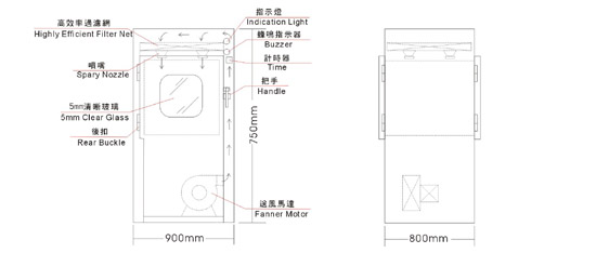 - 傳遞窗兩邊門採用聲光控制,提醒您兩門不能同時處於開啟狀態。
